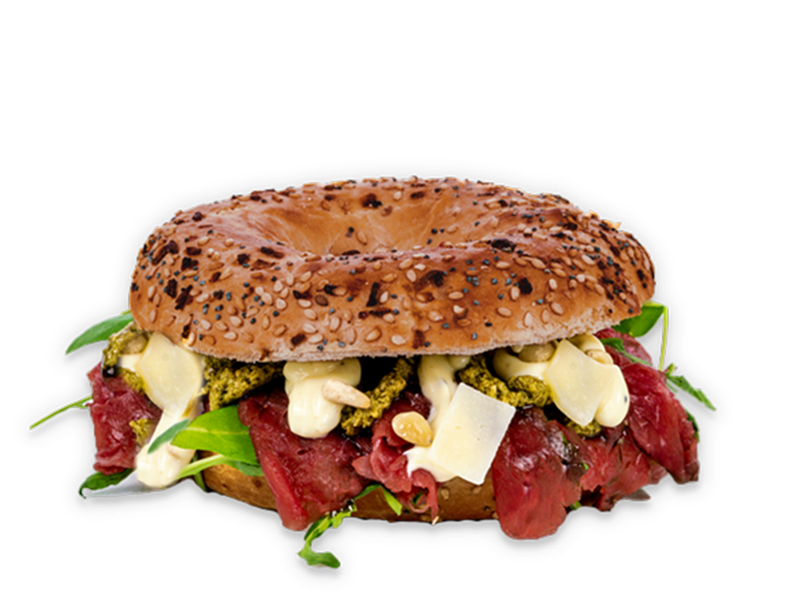 Luxe bagel met rundercarpaccio, Grana Padano, kappertjes en rucola, met pittenmix, truffelmayonaise en pesto-mayonaise. Perfecte lunch.