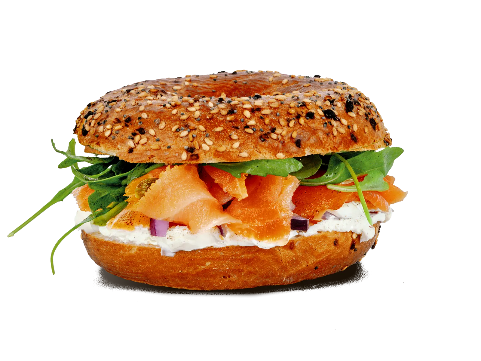 Bagel met gerookte zalm, roomkaas en limoendressing, afgewerkt met rode ui, kappertjes en rucola. Frisse klassieker voor lunch en meeting.