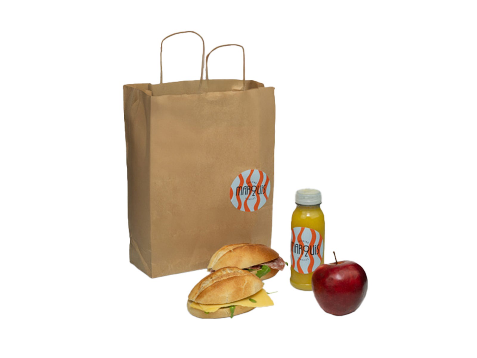 Compleet Lunchpakket Basis 2 belegde broodjes, vers fruit en 250 ml jus d’orange. Vers en handig voor meetings en to-go.