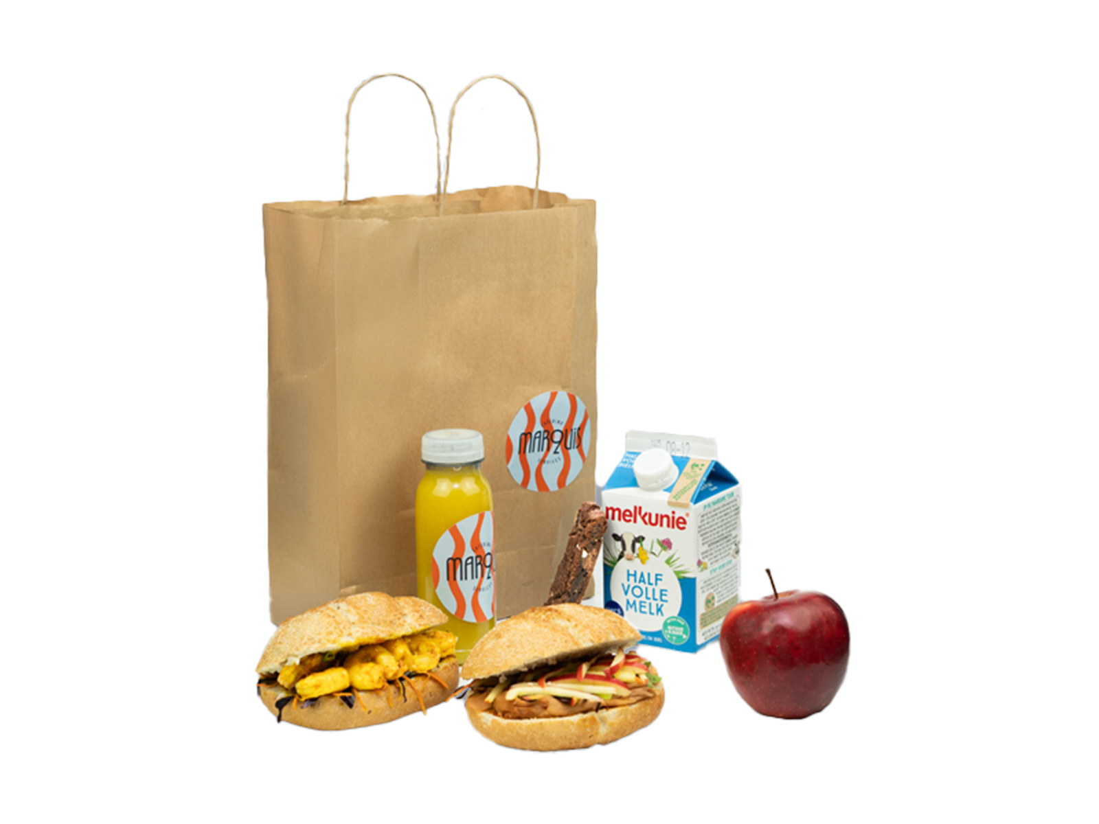 Compleet Lunchpakket Luxe met 2 luxe broodjes, 500 ml melk, 250 ml jus d’orange en een zoetigheid. Representatief en handig voor meetings en events.