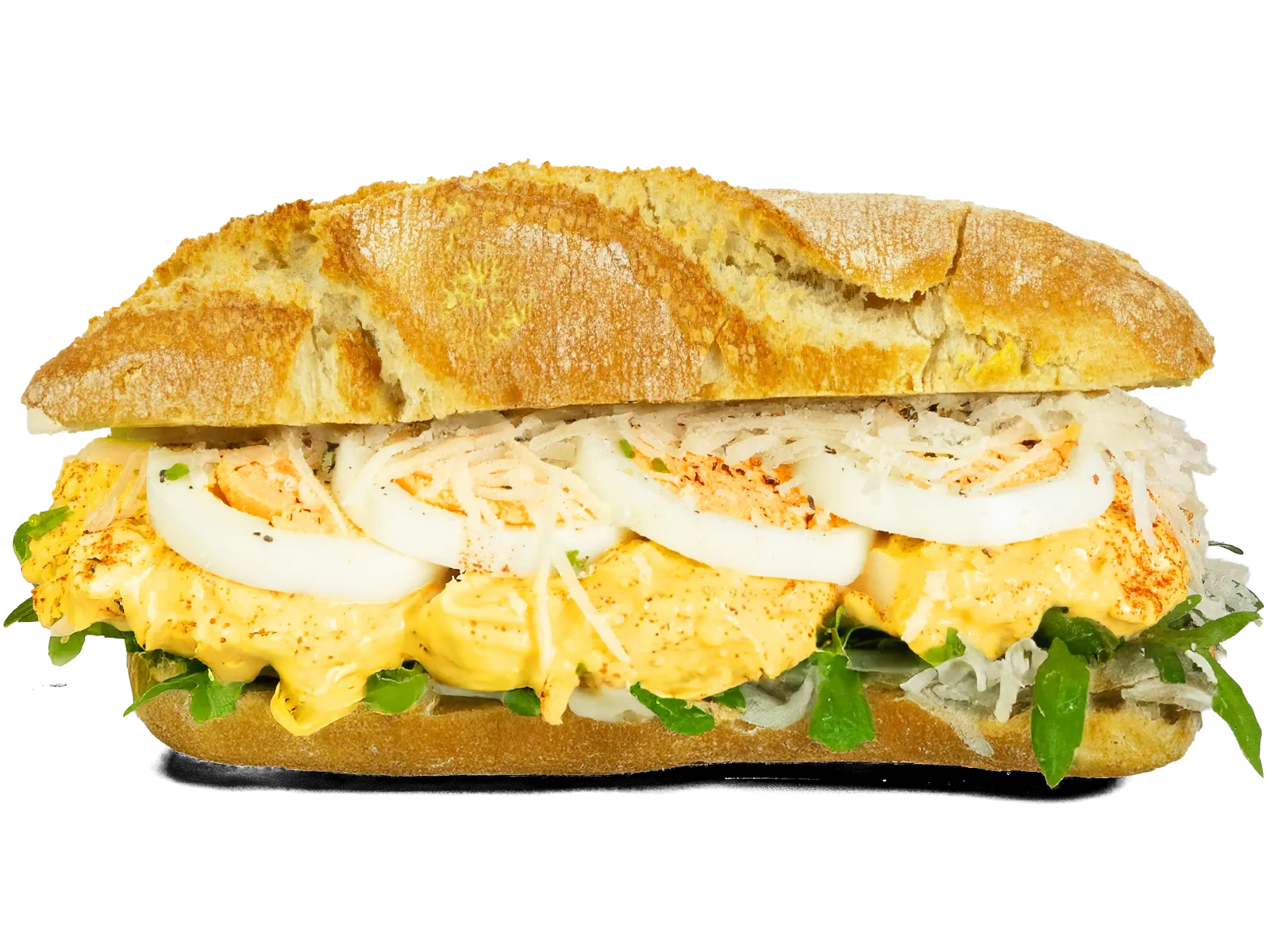 Rustiek broodje met huisgemaakte eiersalade, extra ei, rucola, Grana Padano en bosui. Romig en hartig; ideale lunchklassieker.