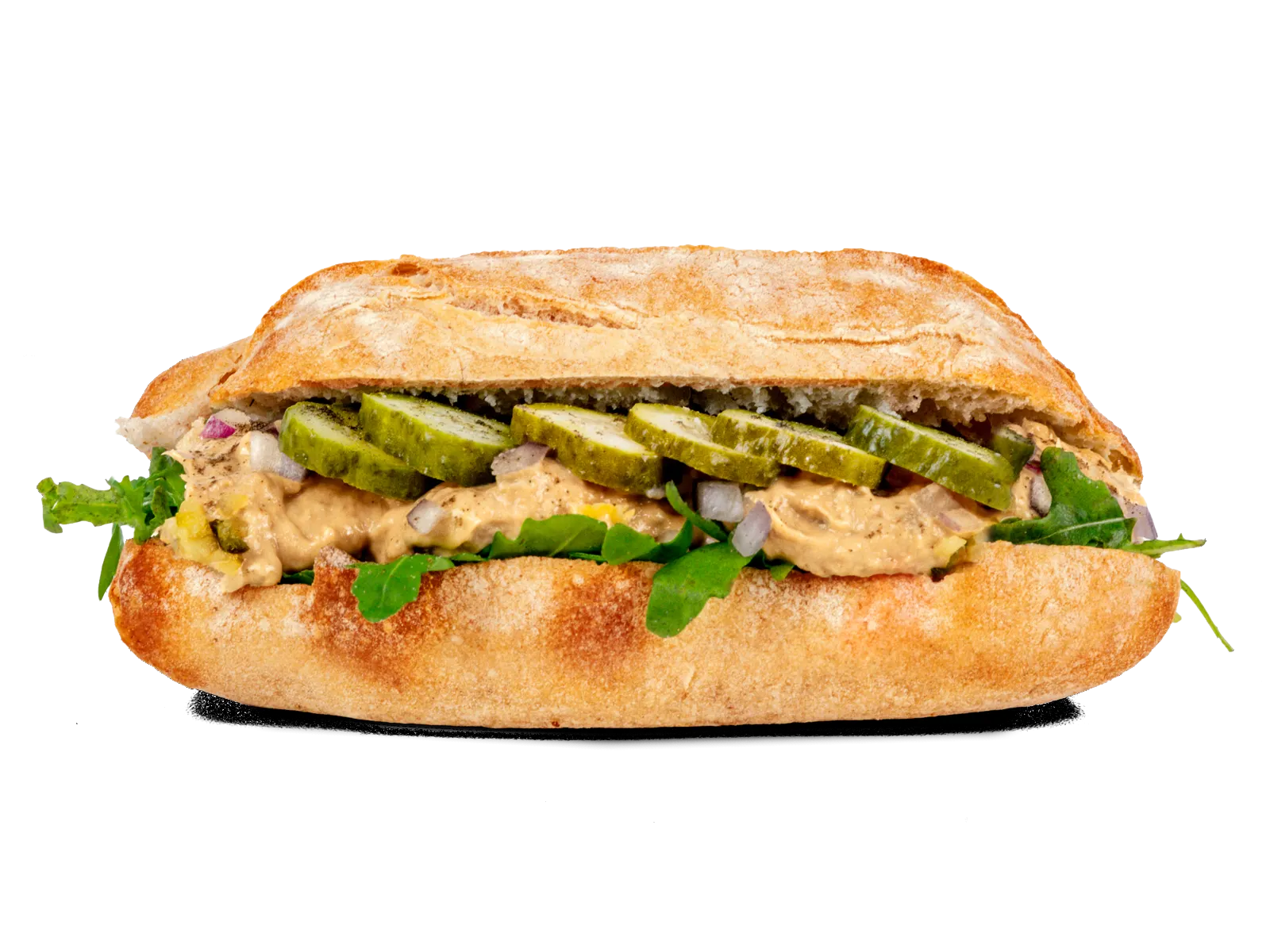 Rustiek broodje met huisgemaakte tonijnsalade, rucola, rode ui, augurk en maïs. Romig, fris en hartig – perfecte lunch.