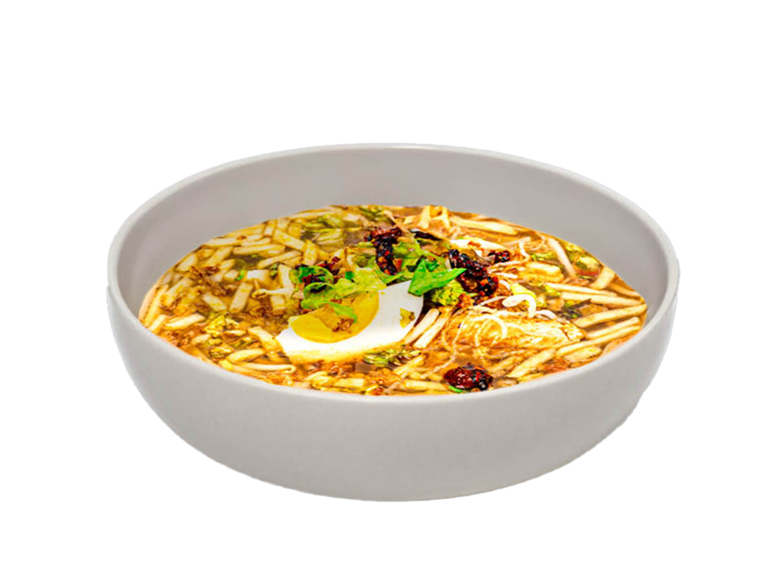 Saoto soep (350 ml) met kippenbouillon, kippendij, taugé, ei, vermicelli en aardappelsticks. Authentieke Surinaamse saoto soep, huisgemaakt en direct te bestellen bij Marquis.