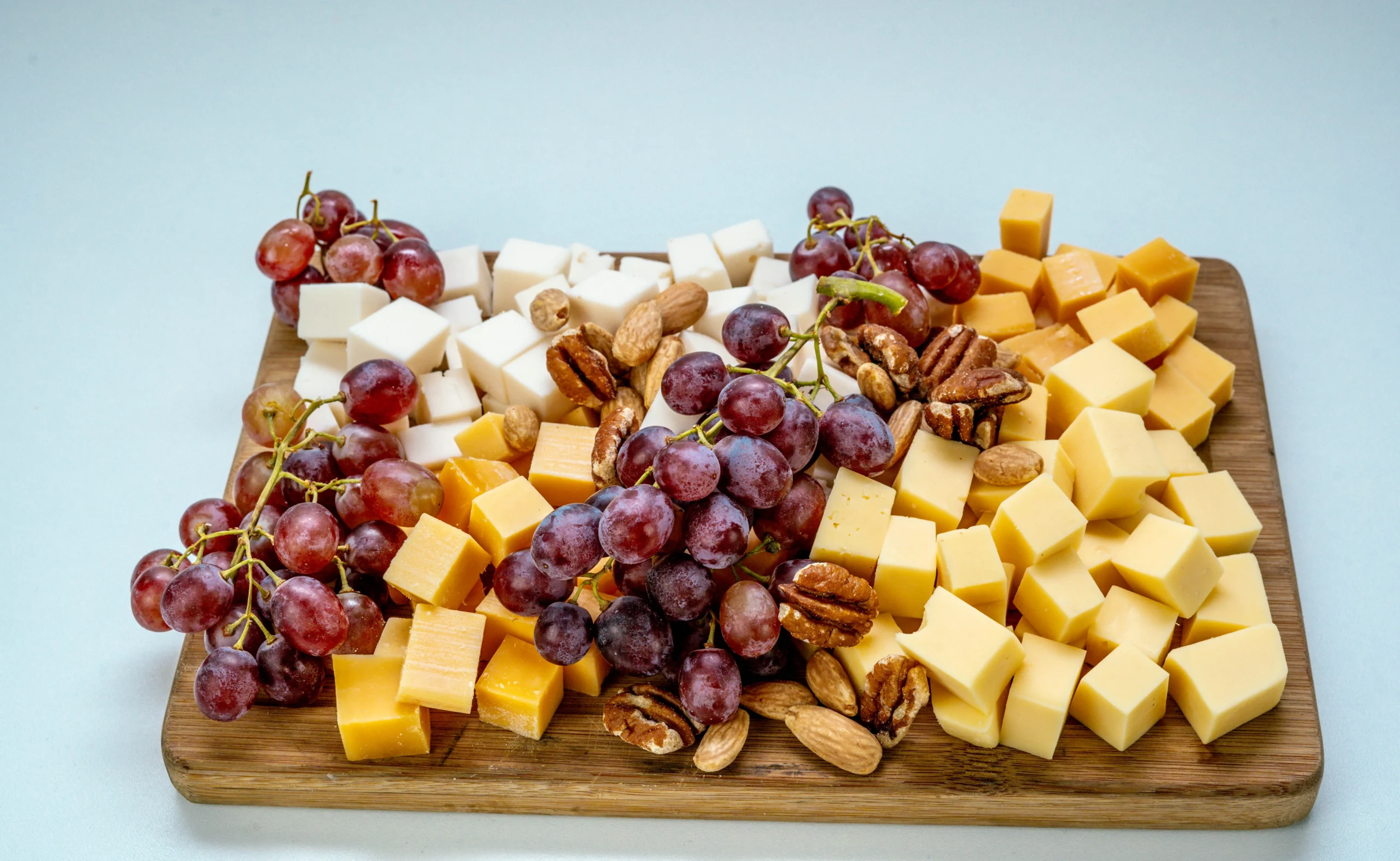 Kaasplateau met oude kaas, jonge kaas en oude geitenkaas, met vijgen, dadels, walnoten en druiven. Perfect om te delen bij borrel of meeting.
